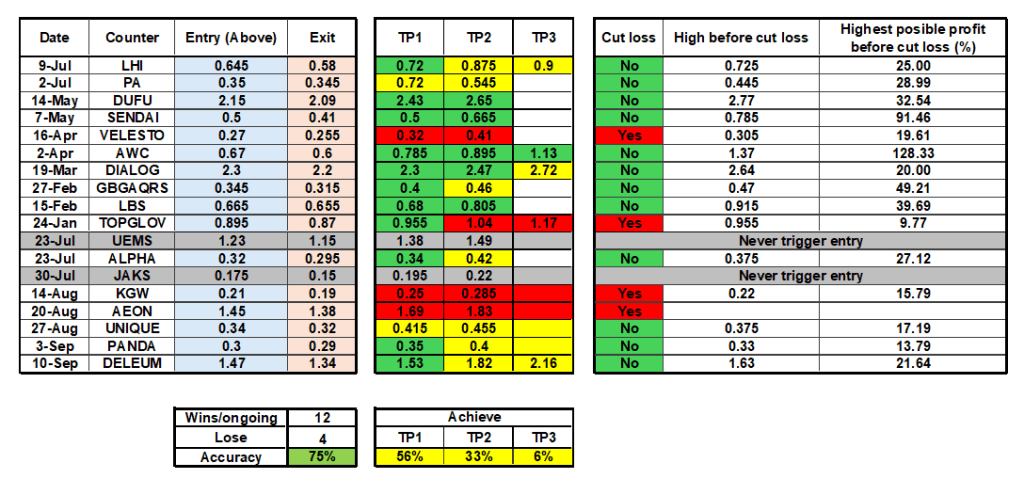 Here, you can track my performance metrics, including entry and exit points, take-profit targets, cut-loss levels, and overall accuracy. (Only BURSA listed counters here)